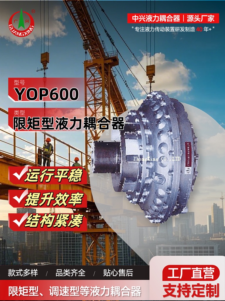 中興液力傳動作為行業領先的液力耦合器制造商,憑借其強大的研發與創新能力,推出了先進的YOP600限矩型液力耦合器,旨在為塔式起重機提供卓越的動力傳輸解決方案。